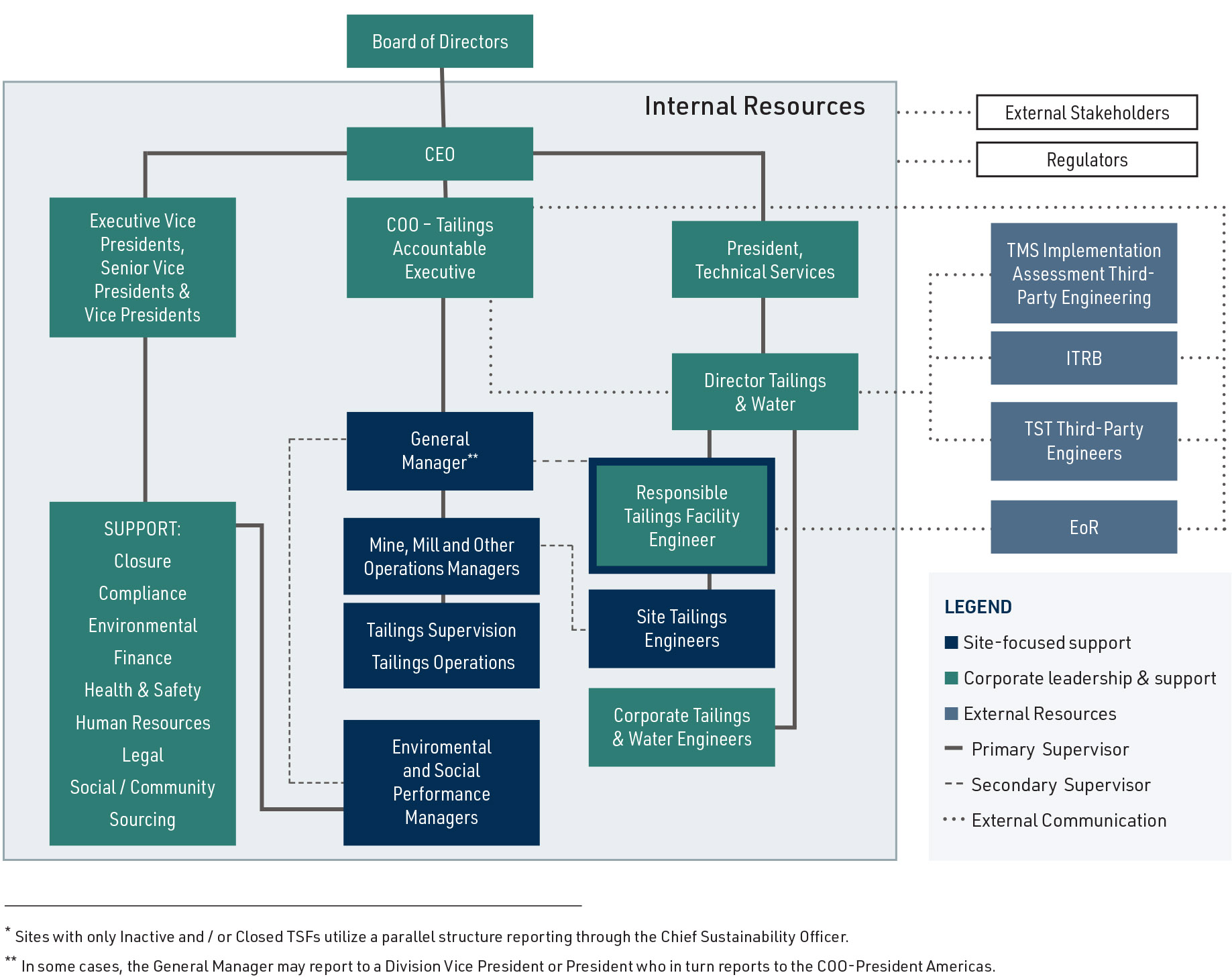 - Corporate Senior Leadership: Executive leadership that participates in major decisions related to the tailings management program, including allocation of resources for TSF-related operations, initiatives, and projects.